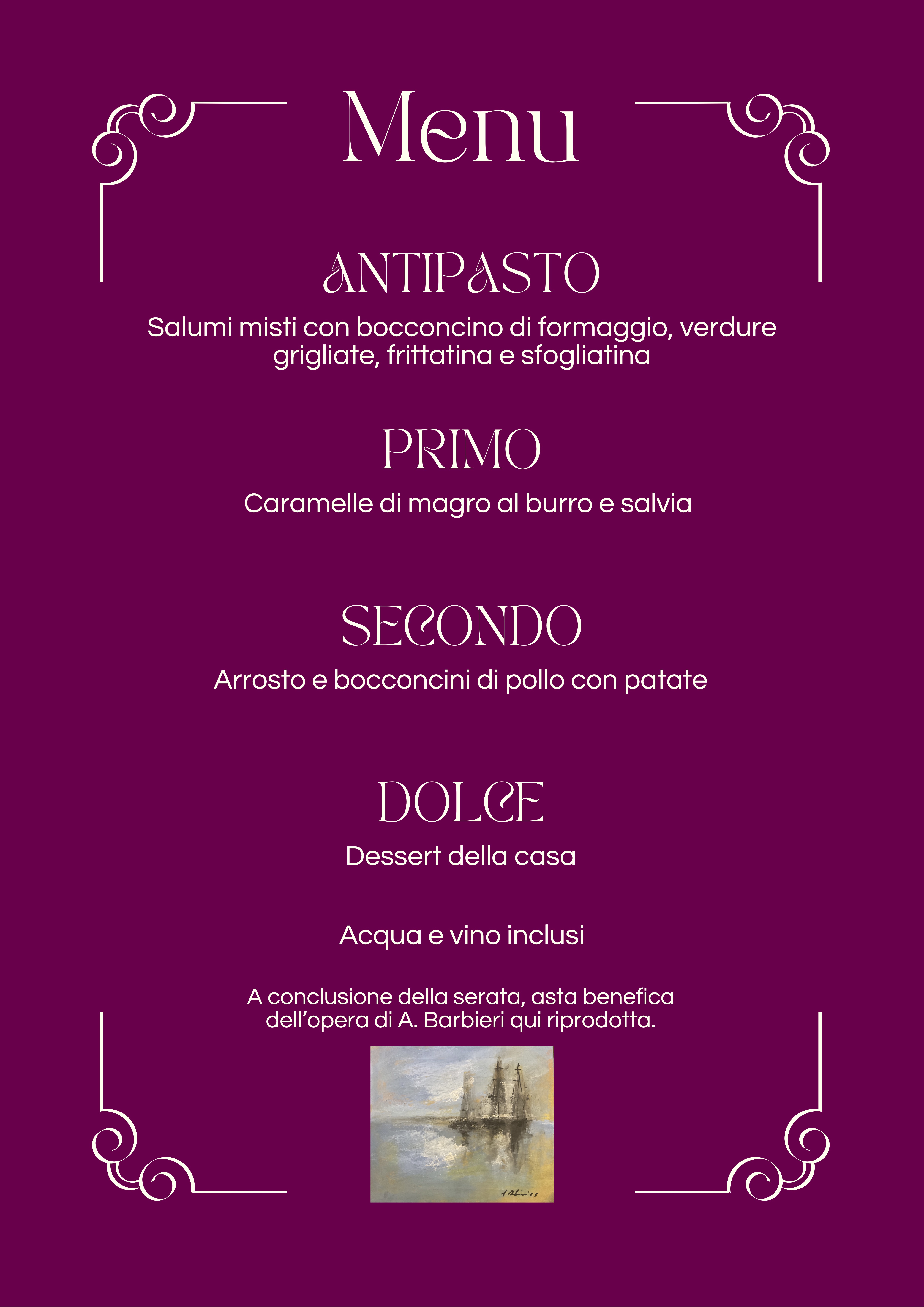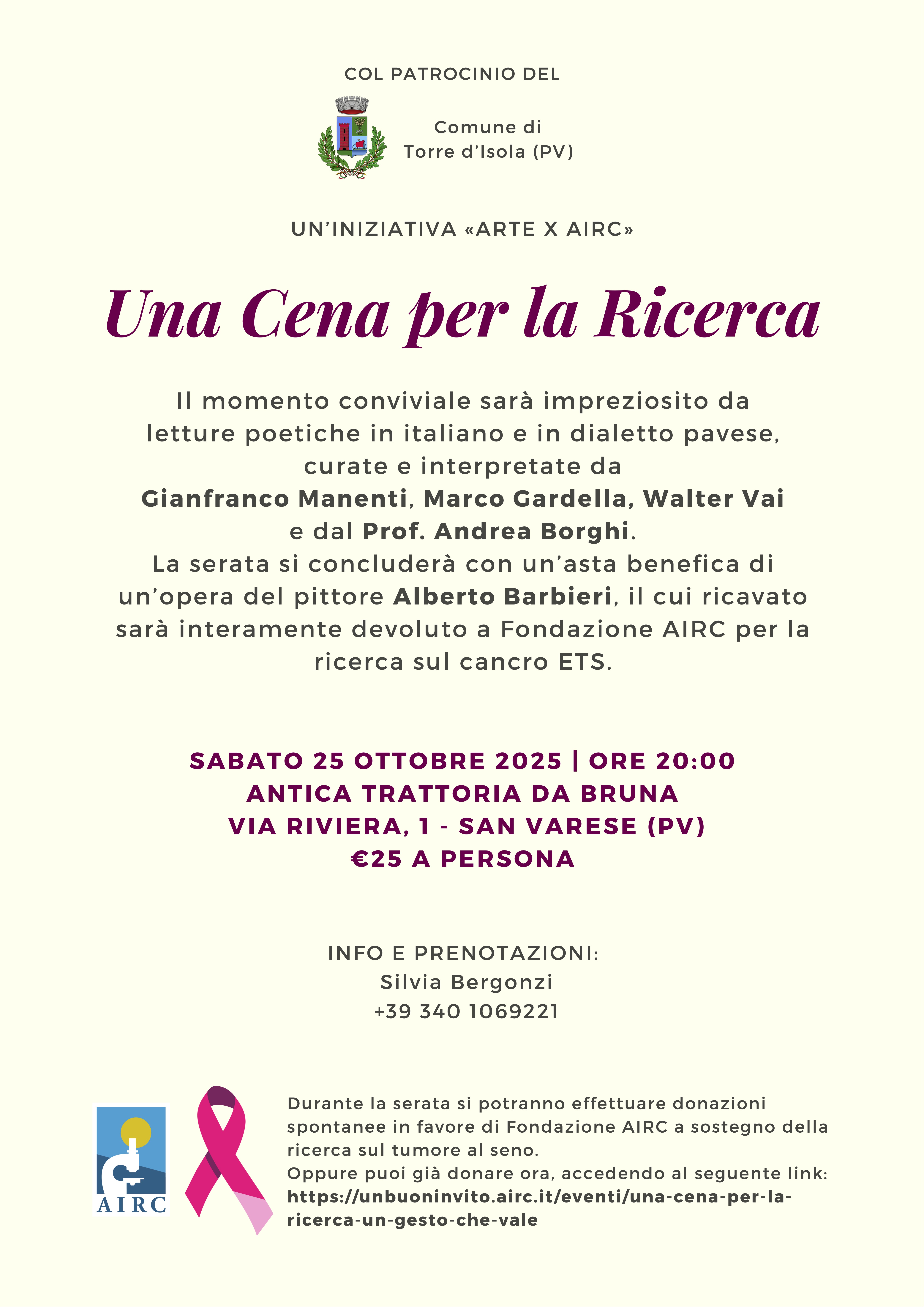 Il momento conviviale sarà impreziosito da letture poetiche in italiano e in dialetto pavese, curate e interpretate da Gianfranco Manenti, Marco Gardella, Walter Vai e dal Prof. Andrea Borghi. La serata si concluderà con un’asta benefica di un’opera del pittore Alberto Barbieri, il cui ricavato sarà interamente devoluto a Fondazione AIRC per la ricerca sul cancro ETS.