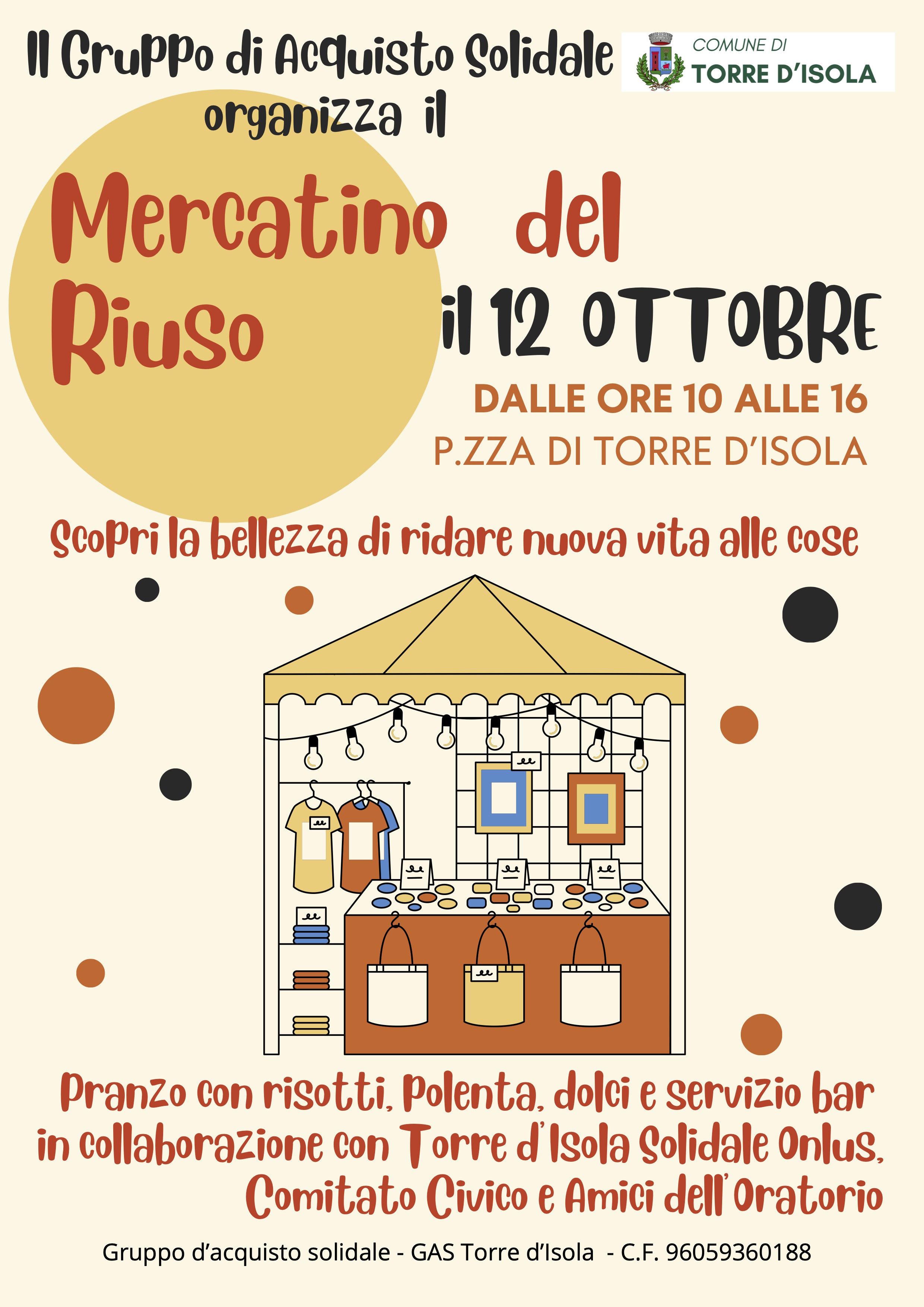 Dalle 10 alle 16 su trenta banchetti saranno in esposizione oggetti dei tipi più vari, buoni per avere una seconda vita in una nuova casa. È il mercatino del riuso, e lo organizza il Gruppo di acquisto solidale di Torre d’Isola, con il patrocinio del Comune e in collaborazione con Torre d’Isola Solidale onlus, Comitato Civico e Associazione Amici dell’Oratorio, che si occuperanno di preparare risotti e polenta, di garantire il servizio bar e di fornire torte e dolci.